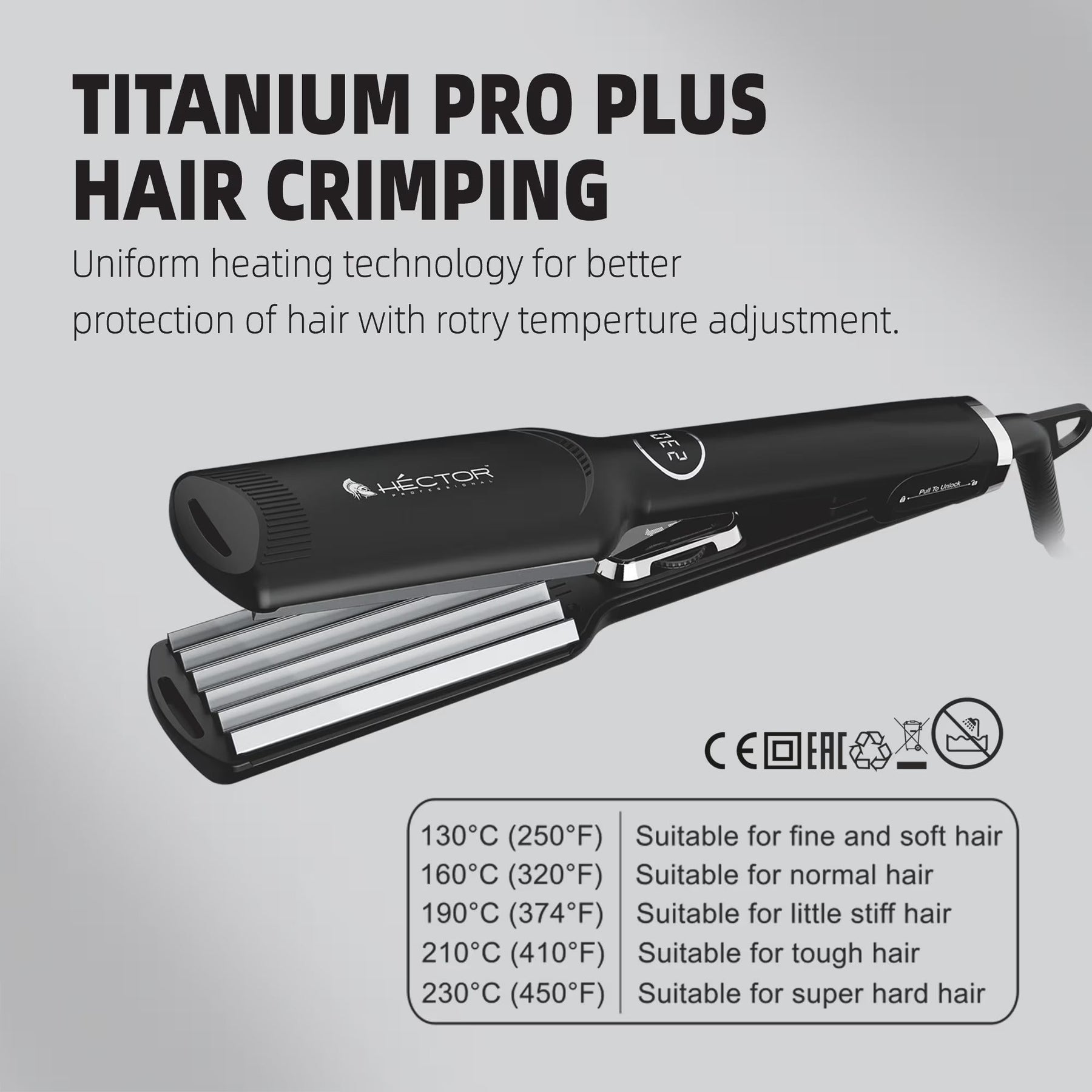 Achieve effortless, defined crimped styles with the Hector Professional Titanium Pro Plus Hair Crimper, designed for professional-quality styling at home.