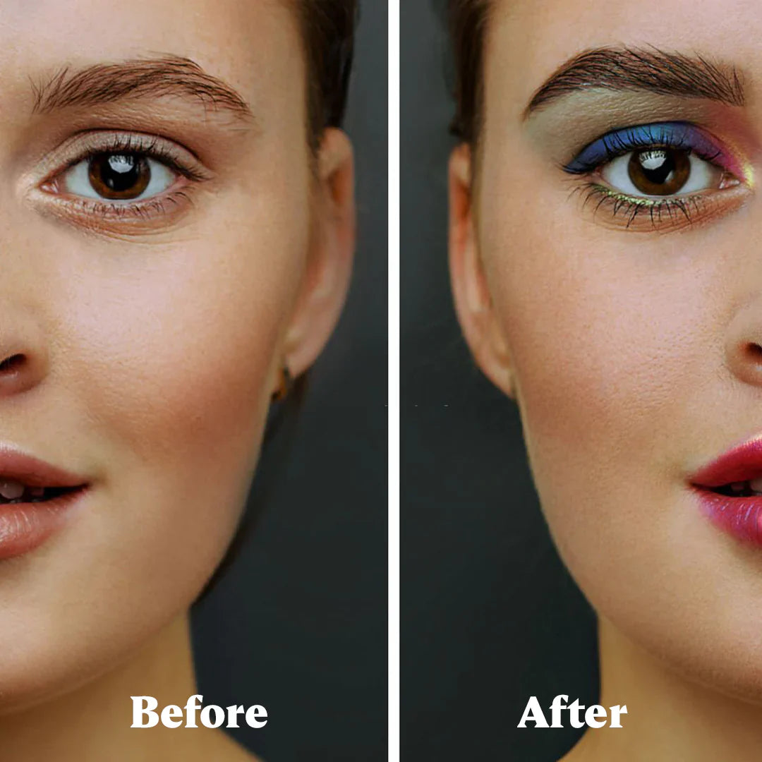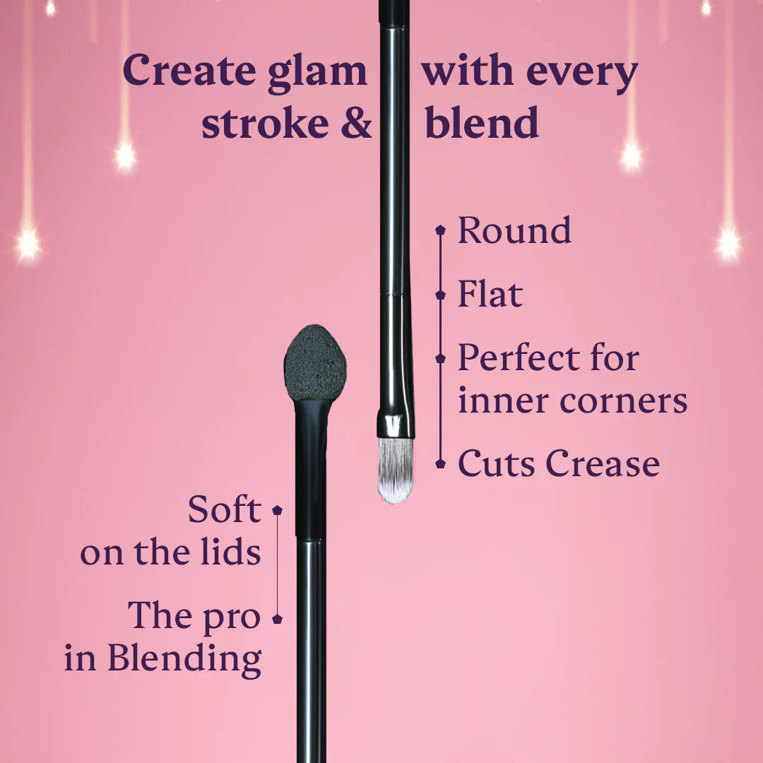 The set includes a pocket-sized brush for perfect application, featuring a two-sided applicator: a cut crease brush that is round, flat, and ideal for inner corners and cut creases, and a sponge applicator that is soft on the lids and perfect for blending.