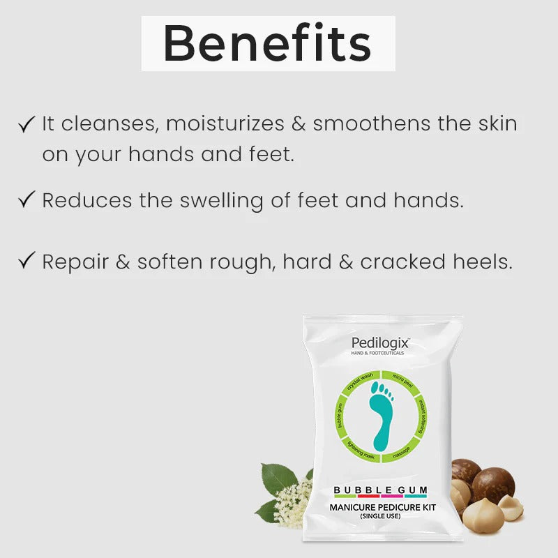O3+ Pedilogix Bubblegum Manicure Pedicure Kit is a fun and effective at-home treatment for your hands and feet. This kit comes with a 55gm scrub and a 10ml lotion, both enriched with the sweet and soothing scent of bubblegum. The gentle exfoliating scrub helps remove dead skin cells, while the nourishing lotion hydrates and softens the skin, leaving your hands and feet smooth, soft, and refreshed. Ideal for all skin types, this manicure-pedicure kit promotes healthy, glowing skin while indulging your senses with a delightful bubblegum fragrance. Treat yourself to a salon-like experience at home with this easy-to-use, complete hand and foot care kit.
