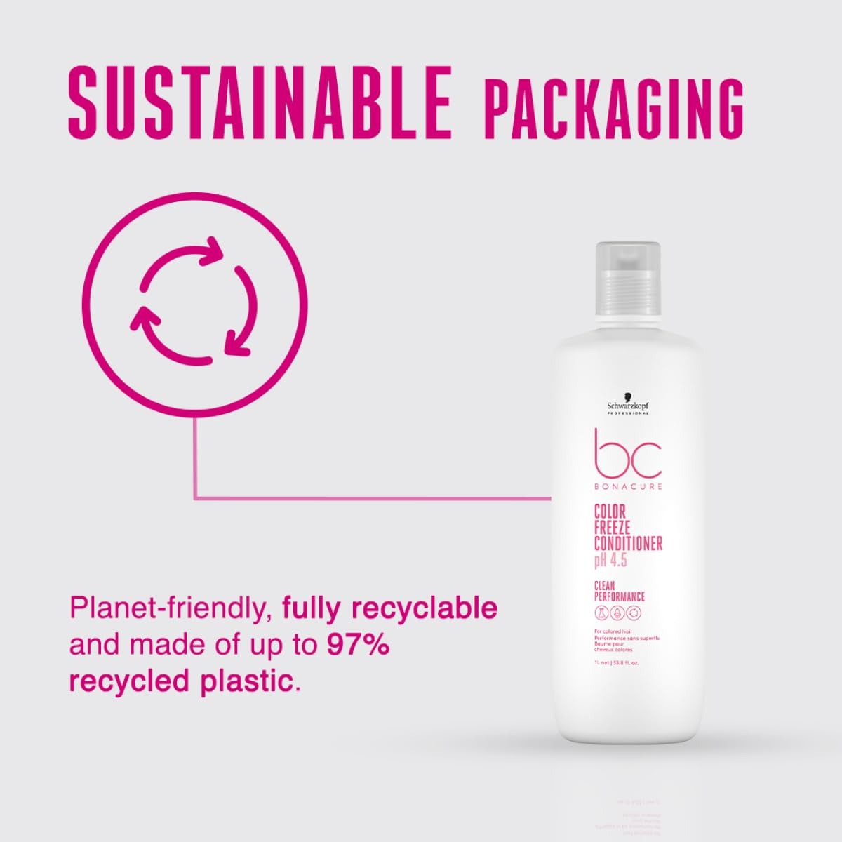 Schwarzkopf Professional BC Bonacure Color Freeze Conditioner is a thick, creamy conditioner for color-treated hair. This high-performance solution, which includes pH 4.5 balancer technology, rapidly tightens the inner hair structure, thoroughly freezing color pigments into the matrix, while lightweight cationic actives deposit on the outer layer, closing the cuticle. Hair is closer than ever to zero fade, with color appearing as brilliant as on day one. Schwarzkopf Professional BC Bonacure Color Freeze provides not only up to 90% color retention, but also complete color and luster down to each individual hair. It collects color pigments for longer-lasting color shine and gives the hair surface a glossy appearance.